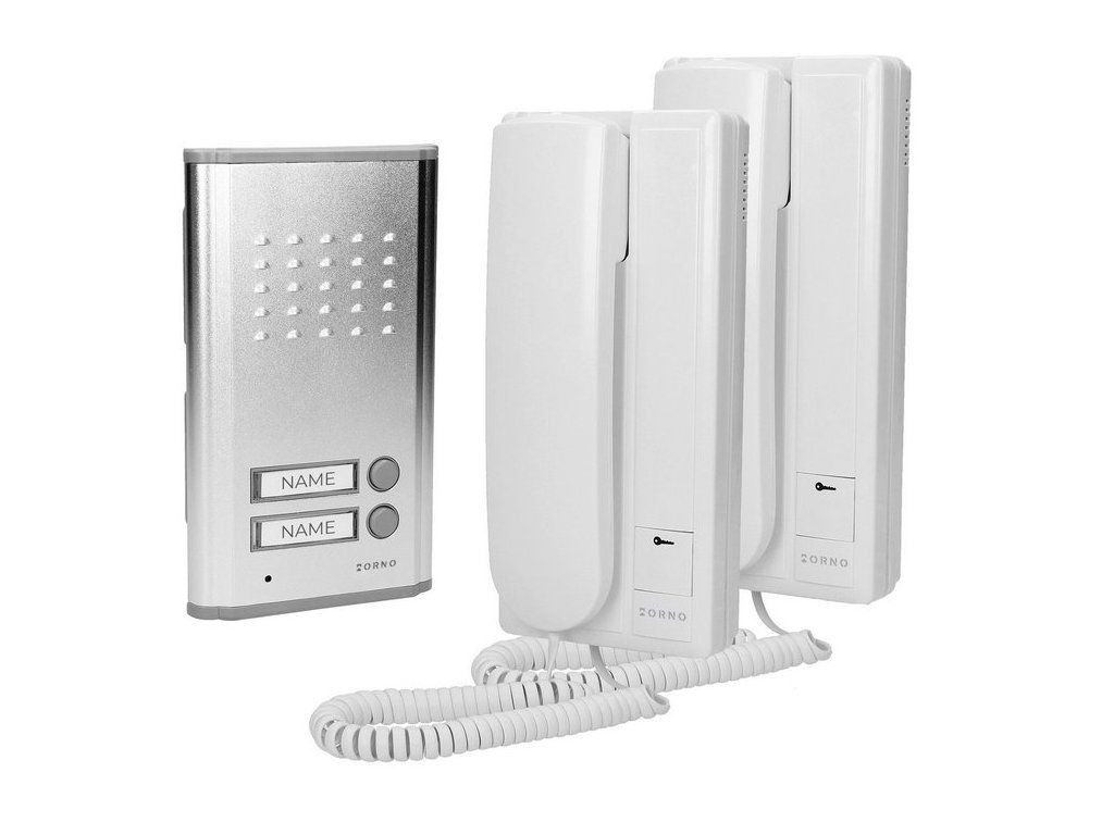 Súprava vchodového dorozumievacieho systému s domovým zvončekom. Audiosystém ( vrátnik ) je zostavený z dvoch domových telefónov a jedného vonkajšieho tabla s dvoma zvončekovými tlačidlami pre zvonenie na 2 bytové jednotky (dvojgeneračný dom). Vonkajšie tablo s mikrofónom, reproduktorom, zvončekovým tlačidlom pre zapustenú montáž do steny. Vonkajšie tablo s hliníkovým predným čelom. 2 drôtové prepojenie medzi telefónom a vonkajším tablem až do vzdialenosti 100m. 2 drôty na ovládanie el. dverného zámku.