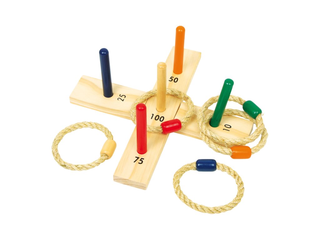 Hráči musí na 5 kolíků zastrčených do sestavitelného kříže z neošetřené borovice házet kroužky (Ø 7 cm) tak, aby dosáhli nejvíce bodů! Hra trénuje jemnou motoriku a koordinaci rukou a očí. Je možné ji vzít kamkoli sebou a kdekoli ji hrát. Hlavní vlastnosti: Trénuje jemnou motoriku a přesnostOblíbená venkovní hraDodatočné parametre