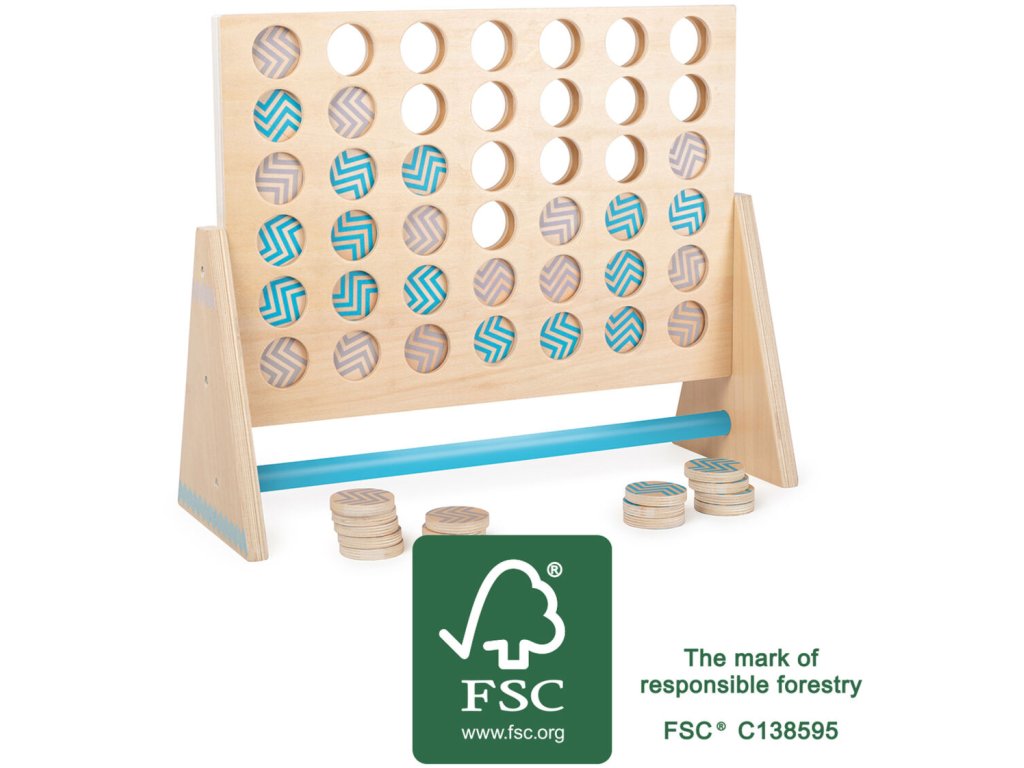 Klasická hra „Čtyři v řadě“ vyrobená ze 100% certifikovaného FSC® dřeva. Velikost XXL zaručuje zábavu pro děti i dospělé. Hra zkusí vaši soustředěnost a logické myšlení, dokážete do řádku umístit 4 dílky stejné barvy za sebou? Dílky jsou dost velké na to, aby je děti mohly pohodlně uchopit. Ideální domů i ven. Kdo se stane vítězem? Hlavní vlastnosti: FSC dřevotrénuje soustředěnost a logické myšlení Značka a certifikát FSC® (Forest Stewardship Council) zaručuje, že dřevo, ze kterého byl produkt vyroben, nebylo vytěženo nelegálně a pochází z lesů obhospodařovaných šetrným či přírodě blízkým způsobem, ve kterém jsou dodržovány přísné environmentální a sociální požadavky. Značka FSC® na výrobku znamená, že svým nákupem pomáháte chránit lesy a podporujete šetrné, odpovědné či přírodě blízké hospodaření, díky kterému jsou naše lesy stabilnější, zdravější, mají přirozenou druhovou skladbu a lépe odolávají negativním následkům klimatických změn.Dodatočné parametre