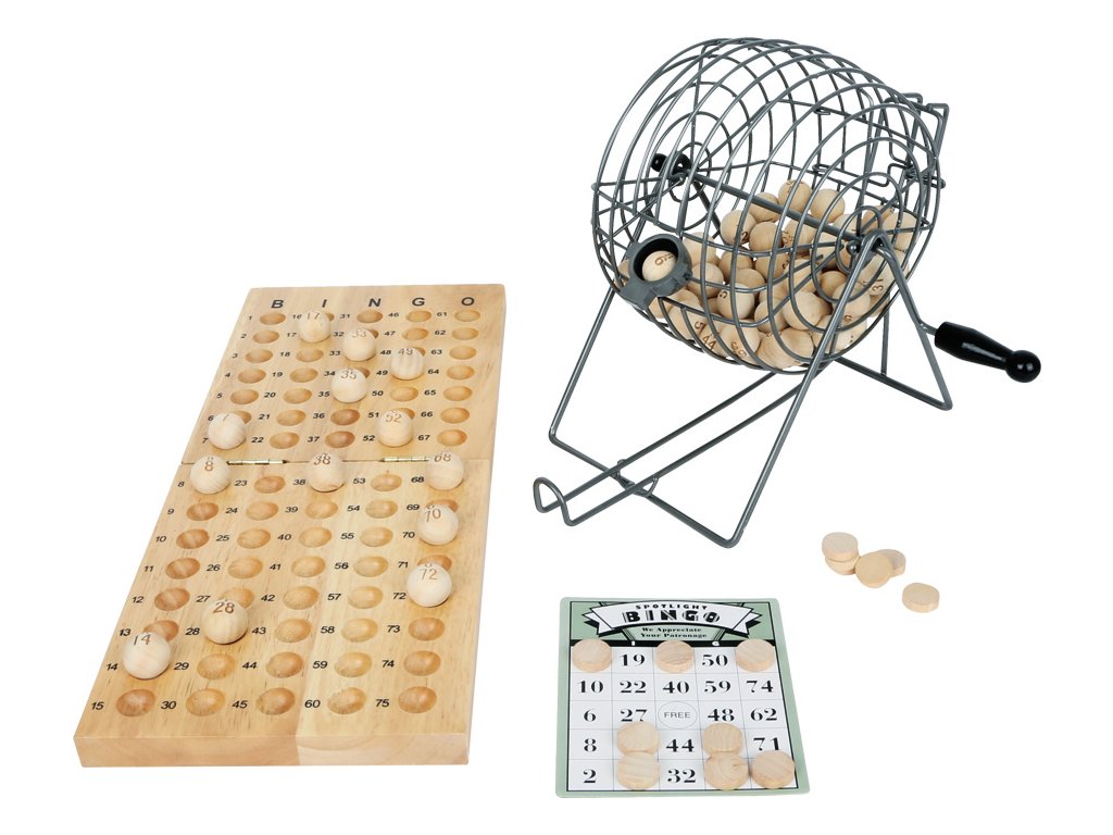 Kovový stroj na míchání losů a vylosování, včetně bohatého příslušenství. Připravit, pozor, hrajeme! Patří k tomu 24 hracích karet, 75 dřevěných kuliček, dřevěné destičky a vysoce kvalitní dřevěná hrací deska.Dodatočné parametre