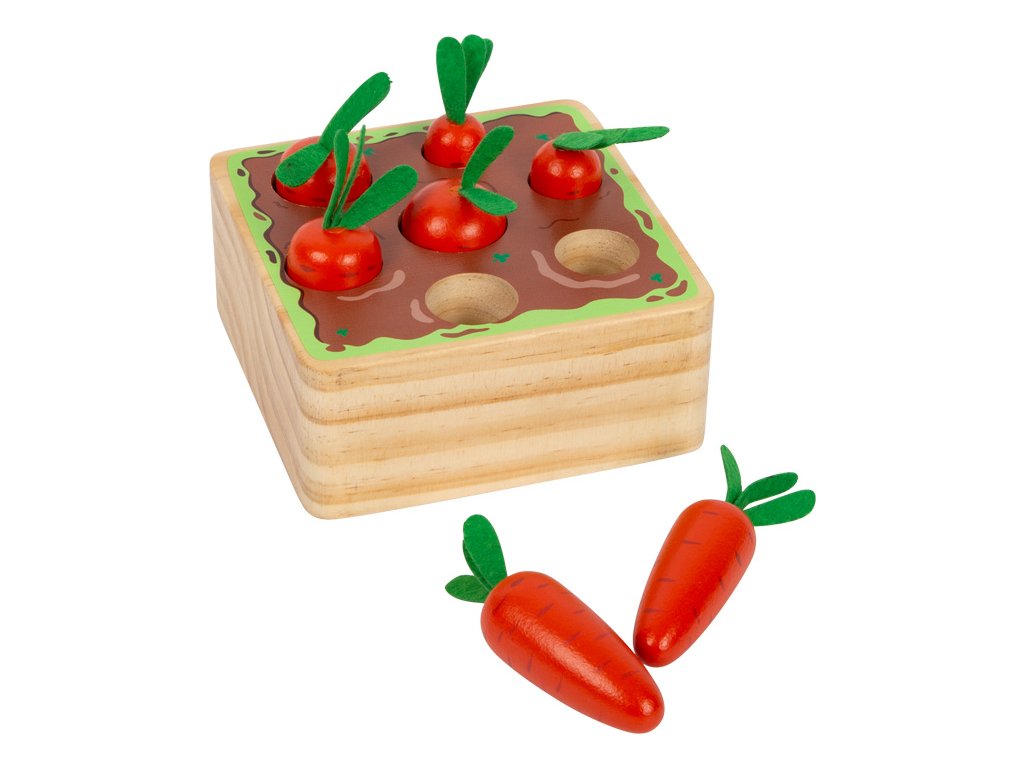 Vzdělávací hra isnpirovaná pedagogickou metodou Montessori. Hra vkládání a třídění tvarů se sedmi mrkvemi různých velikostí. Učení zábavnou formou, děti mohou při třídění a vkládání porovnávat velikosti. Trénuje jemnou motoriku, postřeh, porozumění velikostem. Zelené plstěné části dělají design mrkví realistickým. Perfektní také pro hraní na role, pro mladé zahradníky. Vyrobeno z robustního dřeva, pestré barvy, design bezpečný pro děti. Hlavní vlastnosti: Trénuje jemnou motoriku, postřehVyrobeno ze dřeva a plstiDesign bezpečný pro dětiInspirováno Montessori školouDodatočné parametre