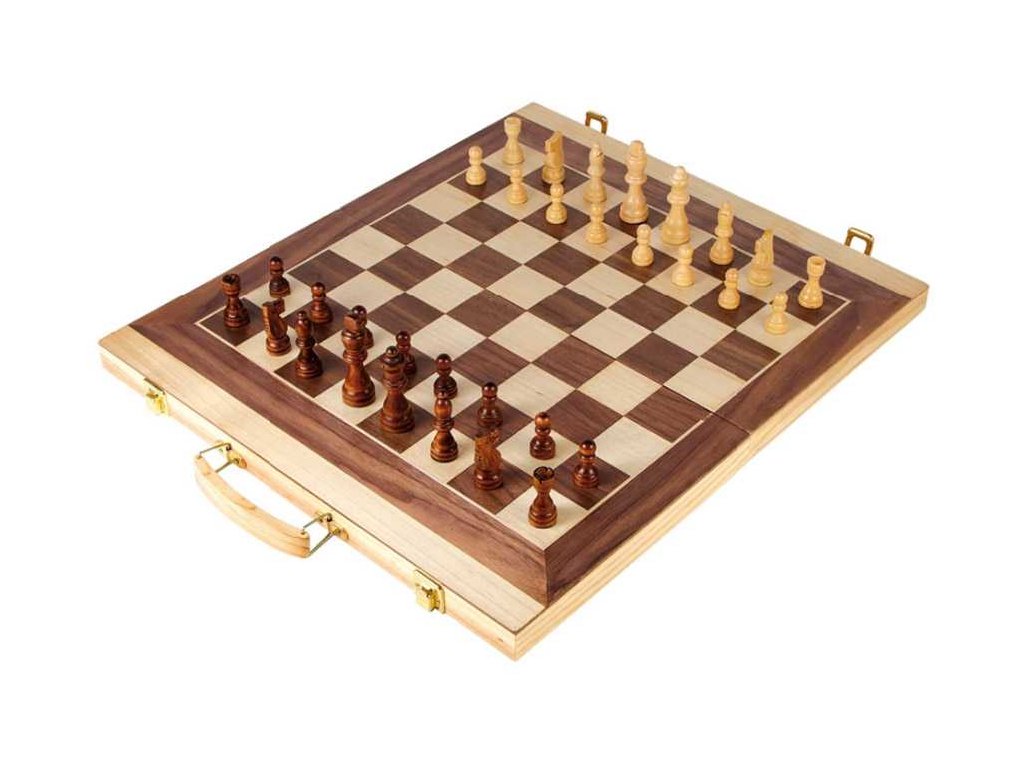 Kvalitně zhotovený dřevěný kufřík s vykládáním na víku a s rukojetí. Velké hrací kameny ze dřeva (3,8x 0,7cm) a velké figurky (3,5 až 7,5 cm) nechají malé i velké stratégy při šachu zapomenout na čas. Kufřík obsahuje kostky, postavičky šachu a kameny hry dáma.Dodatočné parametre