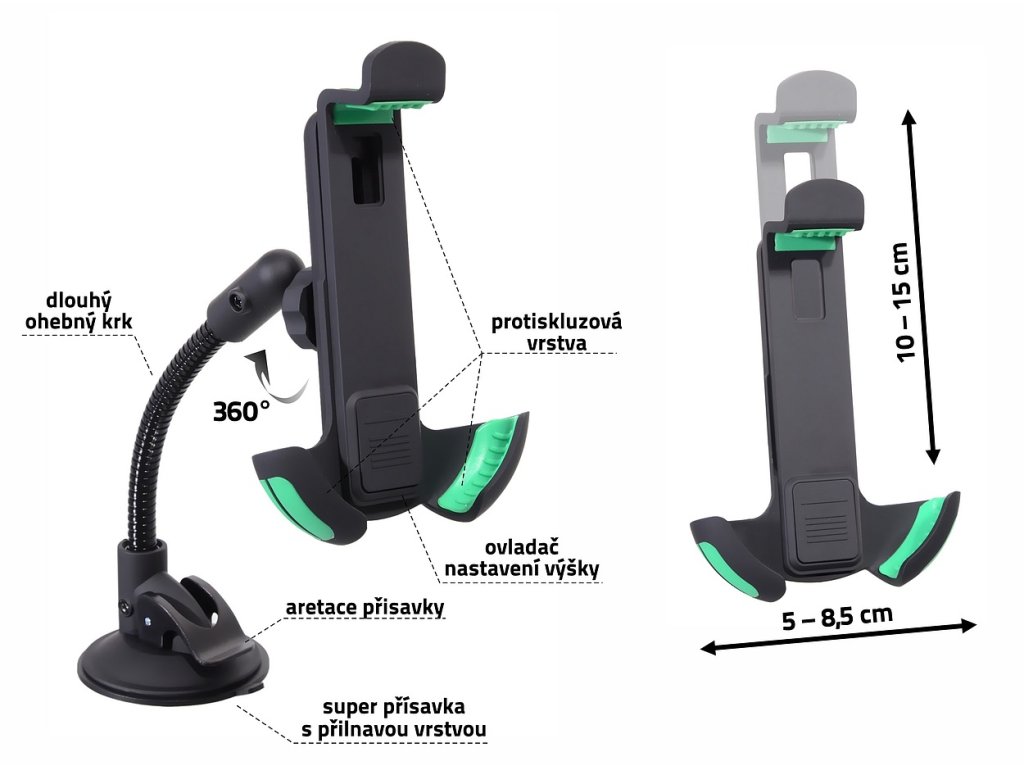 Držák telefonu s extra silnou přísavkou a ohebným ramenem, pro uchycení telefonu či navigace (až do 15 cm).