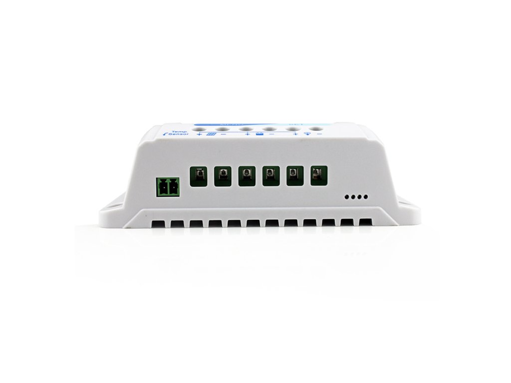 PWM solární regulátor. Svou konstrukcí je určen pro malé ostrovní solární systémy se solárními panely 12V (36 článků) pro dobíjení 12V baterie, nebo solárními panely 24V (72 článků – možno zapojit dva 36 článkové panely do série) pro dobíjení 24V baterie a maximálním nabíjecím proudem do 20A. Výhodou je velmi jednoduchá a nenáročná instalace a spolehlivý provoz. Vestavěný LCD přehledný displej Vám poskytne informace o napětí a proudu solárního panelu, napětí baterie a nabíjecím proudu a také o aktuálním odebíraném proudu pro DC spotřebiče. Také nabízí statistické informace o celkovém množství vyrobené a spotřebované energie.Pomocí tlačítek pod displejem můžete nastavit jeden ze tří typů olověných baterií: utěsněná, gelová anebo otevřená kapalinová baterie. Dále tento model nově nabízí dva USB výstupy pro nabíjení např. mobilního telefonu, či jiných přenosných elektronických zařízení. Maximální proud USB výstupu je 2,4A.Dodatočné parametre