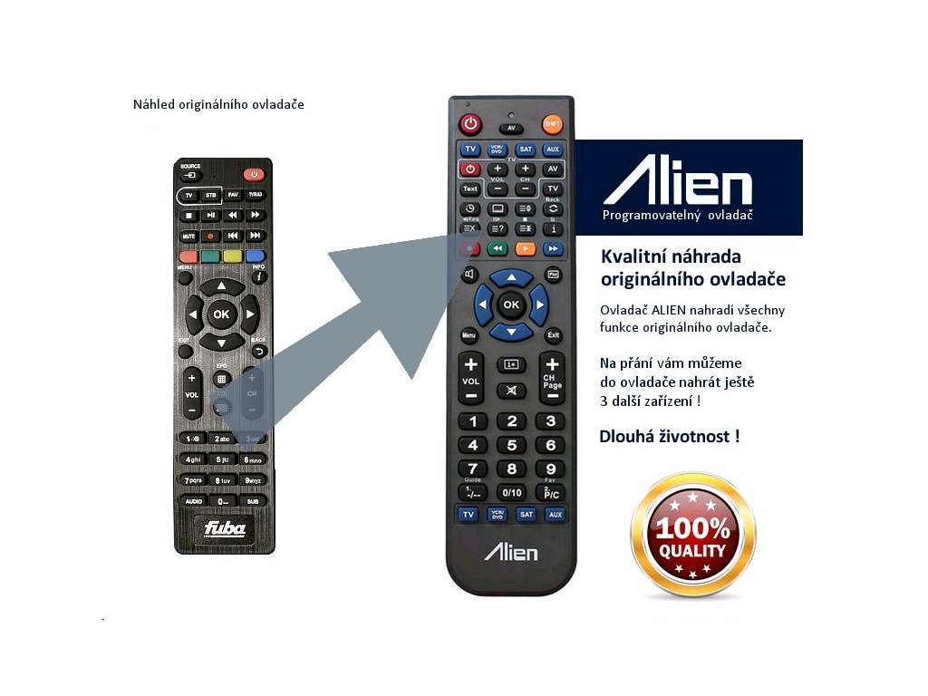 Ovladač ALIEN 4v1 lze naprogramovat až na 4 přístroje. Znamená to, že můžete jedním ovladačem ovládat současně satelitní přijímač, televizor nebo třeba DVD. Chcete-li objednat ovladač naprogramovat ještě další zařízení, napište nám do objednávky do poznámky přesný typ zařízení dálkového ovládání vašeho zařízení.
