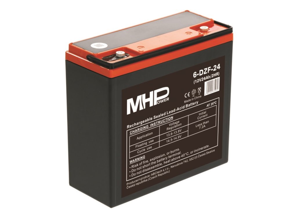 Trakční gelová baterie MHPower 6-DZF-24 je spolehlivým zdrojem energie navrženým pro náročné aplikace, které vyžadují hluboké cykly nabíjení a vybíjení. S kapacitou 24Ah a napětím 12V je ideální pro napájení elektrických vozidel, golfových vozíků, solárních systémů, nebo jako záložní zdroj energie. Díky gelové technologii je odolná vůči vibracím, nevyžaduje údržbu a má delší životnost než tradiční olověné baterie. Baterie je optimalizována pro hluboké cykly (Deep Cycle), což z ní činí ideální volbu pro aplikace s vysokou cyklickou zátěží. Tyto baterie jsou tedy nezbytné všude tam, kde je potřeba stabilního a dlouhodobého výkonu, a kde se očekává časté hluboké vybíjení. Jedná se o uzavřené olověné akumulátory v provedení VRLA. Trakční baterie MHPower jsou určeny především pro následující použití: - Elektroskútry, elektrokola, elektrokoloběžky - Zdravotnická zařízení, zdravotní lehátka, postele, křesla - Lodě, plachetnice, šluny (vnitřní elektromotory a spotřebiče) - Mobilní systémy řízení dopravy, semafory a další řízení dopravy - Solární a fotovoltaické sestavy a jejich zařízení - Běžné elektromotory, golfové vozíky, rybářské čluny - Dětská vozítka, autíčka, motorky - Karavany, zahradní domky, mobil homy, obytné vozy, přívěsy Klíčové vlastnosti trakční baterie - Vysoká spolehlivost a cyklická stálost díky zesíleným mřížkám elektrod - Bezúdržbová baterie - Odolná vůči vibracím, náklonu či úniku elektrolytu - Dostatečná kapacita vhodná pro dlouhé používání - Baterie je optimalizována pro hluboké cykly (Deep Cycle) Nabíjecí a vybíjecí proudy: 1/ Maximální nabíjecí proud: 0,1C až 0,25C (C=hodnota Ah jmenovité kapacity baterie) 2/ Doporučený vybíjecí proud pro zachování dlouhé životnosti: max. 0,3C (C=hodnota Ah jmenovité kapacity baterie) Fyzické charakteristiky Hmotnost [kg]: 7 Šířka [mm]: 182 Výška [mm]: 170 Výška s konektory [mm]: 170 Hloubka [mm]: 78Dodatočné parametre