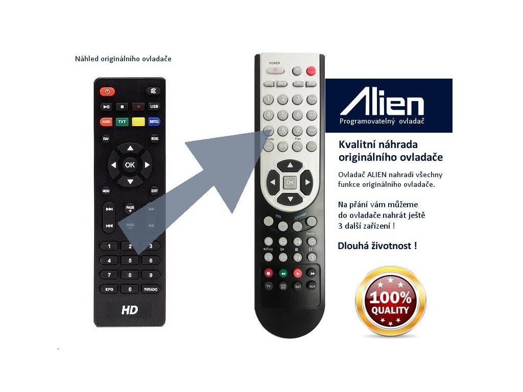 Ovladač ALIEN 4v1 lze naprogramovat až na 4 přístroje. Znamená to, že můžete jedním ovladačem ovládat současně satelitní přijímač, televizor nebo třeba DVD. Chcete-li objednat ovladač naprogramovat ještě další zařízení, napište nám do objednávky do poznámky přesný typ zařízení dálkového ovládání vašeho zařízení.