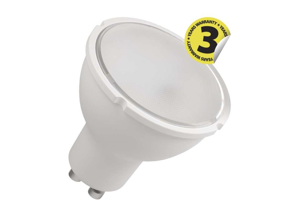 LED žárovka GU10 s příkonem 6.1 W s teplou bílou barvou světla. Nahrazuje 45 W klasickou žárovku. Světelný tok 560 lm, teplota chromatičnosti 3000 K, úhel vyzařování 110°.