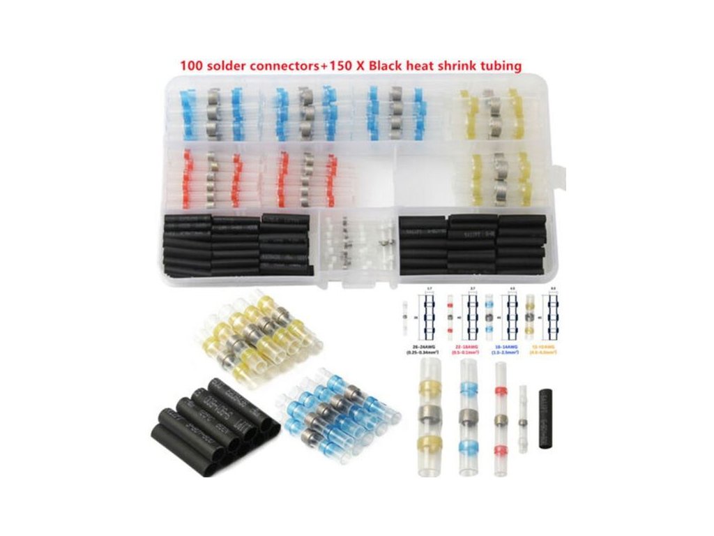 250ks kabelových spojek s nízkoteplotní SnBi pájkou a smršťovací bužírkou. Vhodné pro spojování automobilové a jiné kabeláže.