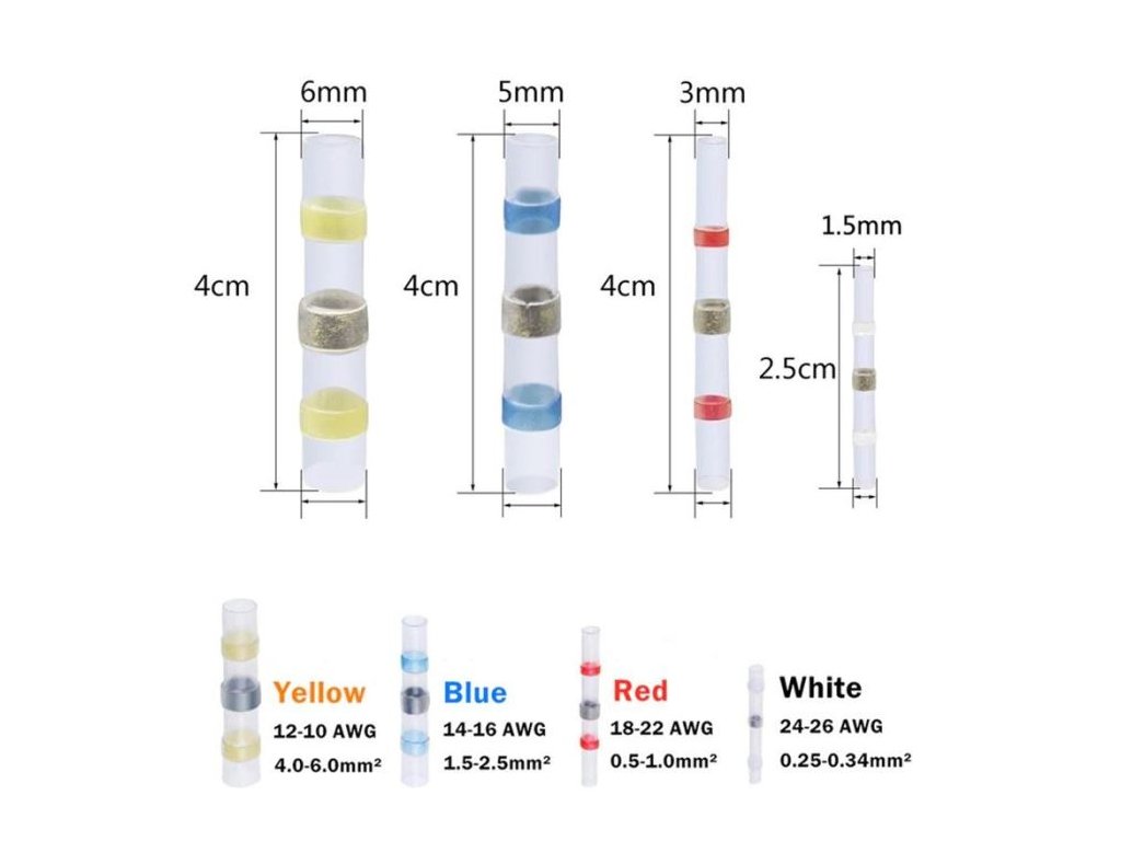 60ks kabelových spojek s cínem a smršťovačkou. Vhodné pro spojování automobilové a jiné kabeláže.10x bílá spojka: AWG 26-24 pro kabely 0.25-0.34mm2
