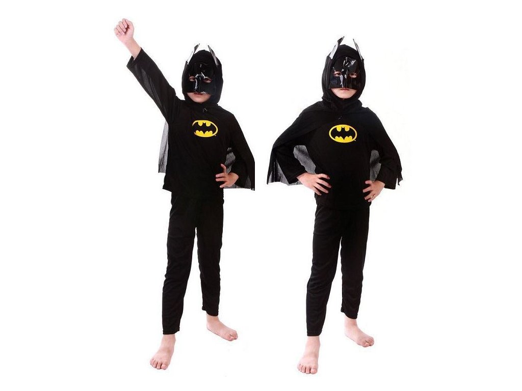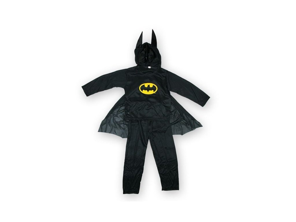 Karnevalový kostým Batman pro cca čtyřleté dítě, vyrobený z polyesteru.Třídílný kostým se skládá z: Masky, trička s potiskem a kalhot na gumu.