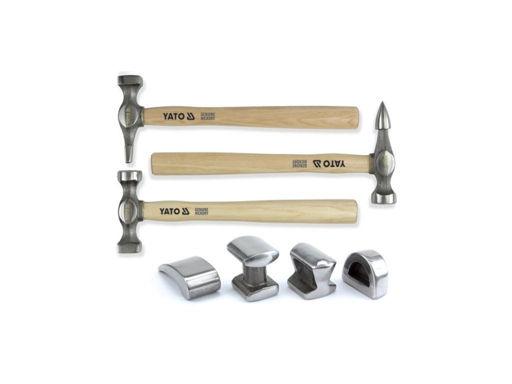 Sada klempířských kladívek. Tři kladiva s různými čelními profily, připevněny na rukojeti z ořechu, čtyři vyměnitelná ocelová kování k profilování plechu.