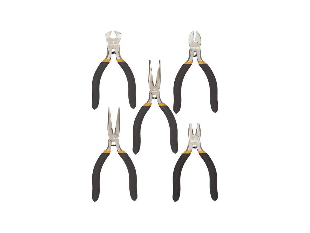 Mini kleště 125mm, sada 5ks, TOPEXSada přesných kleští TOPEX obsahuje pět nejčastěji používaných kleští. Každý nástroj je vyroben z kalené oceli, navíc řezné plochy jsou indukčně kalené.