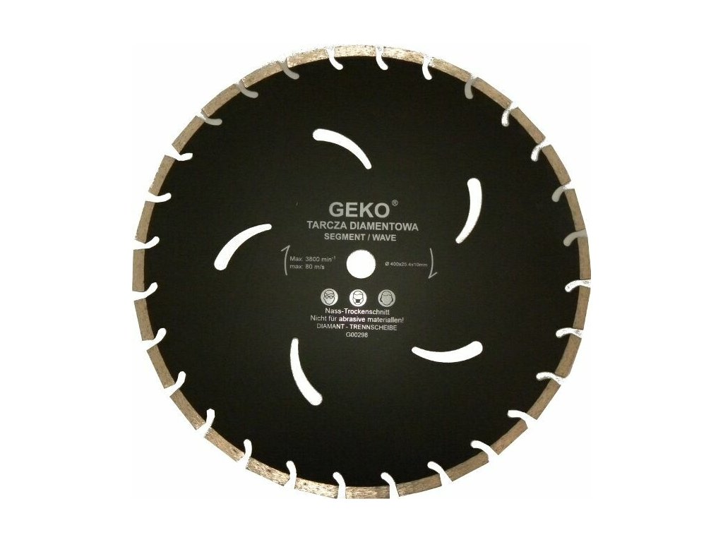 Precizní diamantový řezný kotouč GEKO s přerušovaným diamantovým segmentem po celém obvodu (s drážkami, výřezy), který je rozdělený na určitý počet užších segmentů. Tyto výřezy kotouč během řezání chladí a vynáší obroušený materiál z řezu ven. Segmentový kotouč se hodí pro hluboké řezání tvrdých stavebních materiálů jako je např. beton, železobeton, asfalt, zdivo, kámen apod., vytváří širší řez a může štípat okraje. Se segmentovým kotoučem je možné řezat za mokra i za sucha.Technické parametry: