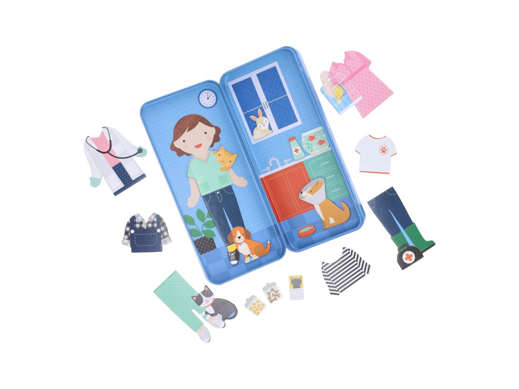 Magnetická sada navržená k tomu, aby inspirovala dívky. Inspirujte milovnici zvířátek, aby se stala zvěrolékařkou. K dispozici je řada magnetických částí oděvu a profesní výbavy, které se scénami ve vnitřních prostorách odolné kovové krabičky tvoří praktickou sadu na cesty. Hra nabízí množství kombinací nabízejících velký prostor vlastní fantazii. Hlavní vlastnosti: 29 dílků, 2 pozadípraktické baleníDodatočné parametre