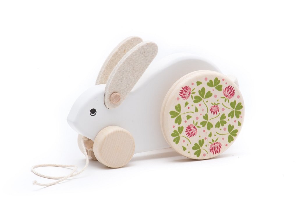 Copak to utíká?Je to králíček s velkými, květinovými koly! Může skákat. Jak je tohle možné? Hračka má jednoduchý mechanismus. Velká kola jsou těžká a jejich osa otáčení je mimo střed. To znamená, že se kolečka neotáčí ve středu, ale po obvodu kruhu. To dává efekt stoupání a klesání. Králíka je potřeba zatáhnout za provázek a pak začne poskakovat. Hračka svým charakterem a pohybovou animací působí na představivost dětí. Grafika na největších kolech buduje image louky plné trávy a květin, kde se obvykle zdržují králíci. Dítě hrající si s králíčkem poznává svět zvířat. Díky tomu si ho začne všímat a vážit si ho. Hračka také rozvíjí manuální dovednosti a přispívá k rozvoji hrubé motoriky, zahrnuje pohyby rukou a těla. Jedinečnost dřevěných hraček spočívá v tom, že jsou zcela bezpečné pro zdraví dítěte. Společnost Bajo nabízí mnoho hraček lakovaných barvami, proto je jejich prioritou kvalita a zdravotní nezávadnost, která je potvrzená certifikáty. Kontrolovány a testovány jsou také prvky vyrobené z plastu a kovu. Tato hračka a obal jsou vyrobeny z přírodních zdrojů a lze je snadno recyklovat. Doporučujeme povrch hračky čistit pouze vlhkým hadříkem. Nevystavujte, prosím, tuto hračku vysokým teplotám nebo vysoké vlhkosti, dřevo se za těchto podmínek může ohýbat a deformovat. Splňuje všechny evropské bezpečnostní normy. Hlavní vlastnosti: rozvíjí motorické dovednosti a stimuluje představivost a kreativitusnadno uchopitelnéDodatočné parametre