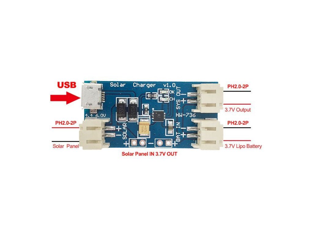 Praktický modul pro nabíjení a provoz Li-Pol článku 3,7V s libovolnou kapacitou. Nabíjet lze z USB nebo solárního článku a zároveň lze odebírat proud z napájecího článku.**Specifikace:**