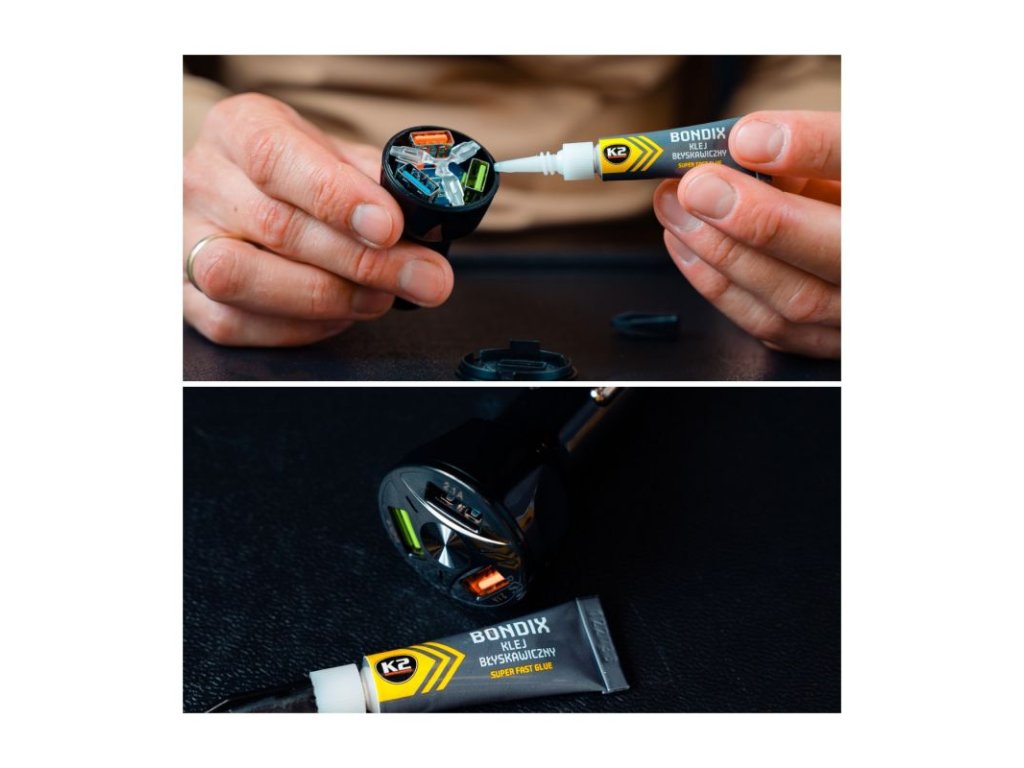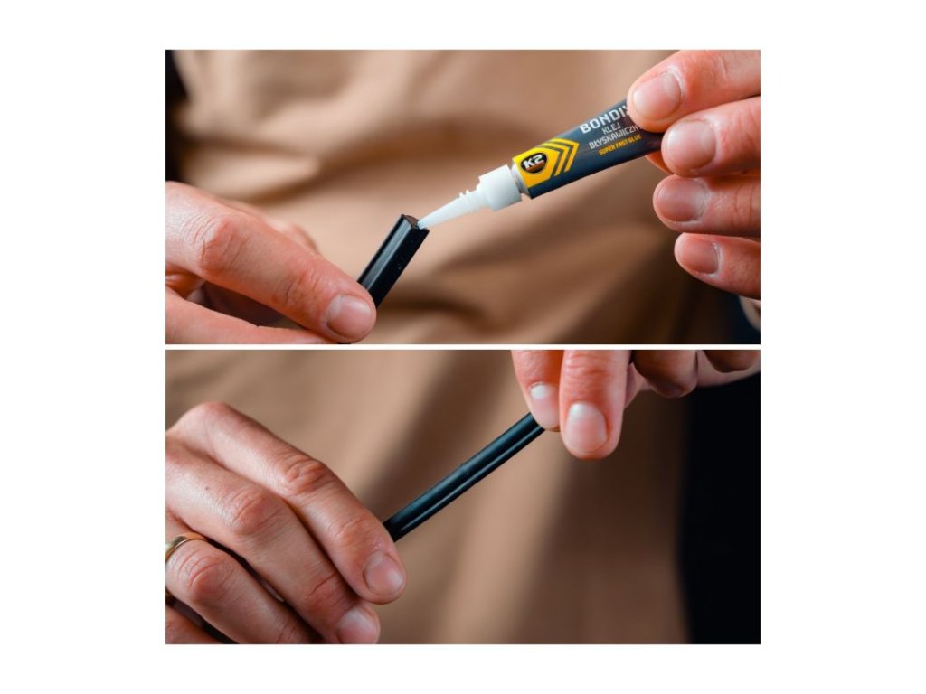 2. Naneste minimální množství lepidla na jeden z lepených povrchů, silně přitlačte a nehýbejte lepenými díly 15 až 20 sekund (čím je nanesená vrstva lepidla tenčí, tím je spoj pevnější).
