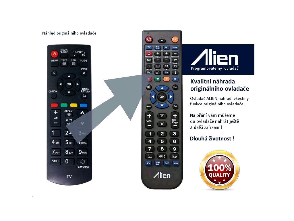 Ovladač obdržíte naprogramovaný na vaše zařízení. ALIEN nahrazuje všechny funkce originálního ovladače.