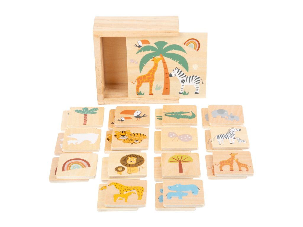Safari přímo v dětském pokojíku! Abyste našli všech 14 dvojic obrázků budete potřebovat dobrou pamět a soustředěnost. Malé dřevěné dílky s krásnými ilustracemi safari v trendy barvách upoutají pozornost každého dítěte. Budou se chtít dozvědět více o tomto zvířecím světe. Nejen, že si děti při hraní pexesa procvičí pamět, ale také se naučí pojmenovat nová zvířata. Pexeso je uloženo v dřevěném boxu, takže je perfektní i na cesty.Dodatočné parametre