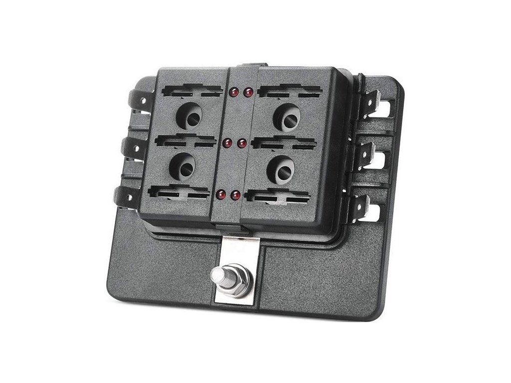 Distribuční blok pojistek s centrálním přívodem a 6 pojistkami 19x12 s optickou kontrolou stavu přerušení (6x LED). Přívod je pod šroubkem M6, jednotlivé větve lze připojit fastony . V dodávce rovněžsamolepky s anglickými názvy chráněných objektů.Autopojistky 19x12 nejsou součástí balení.