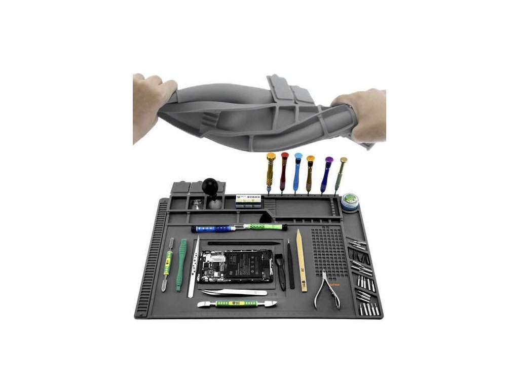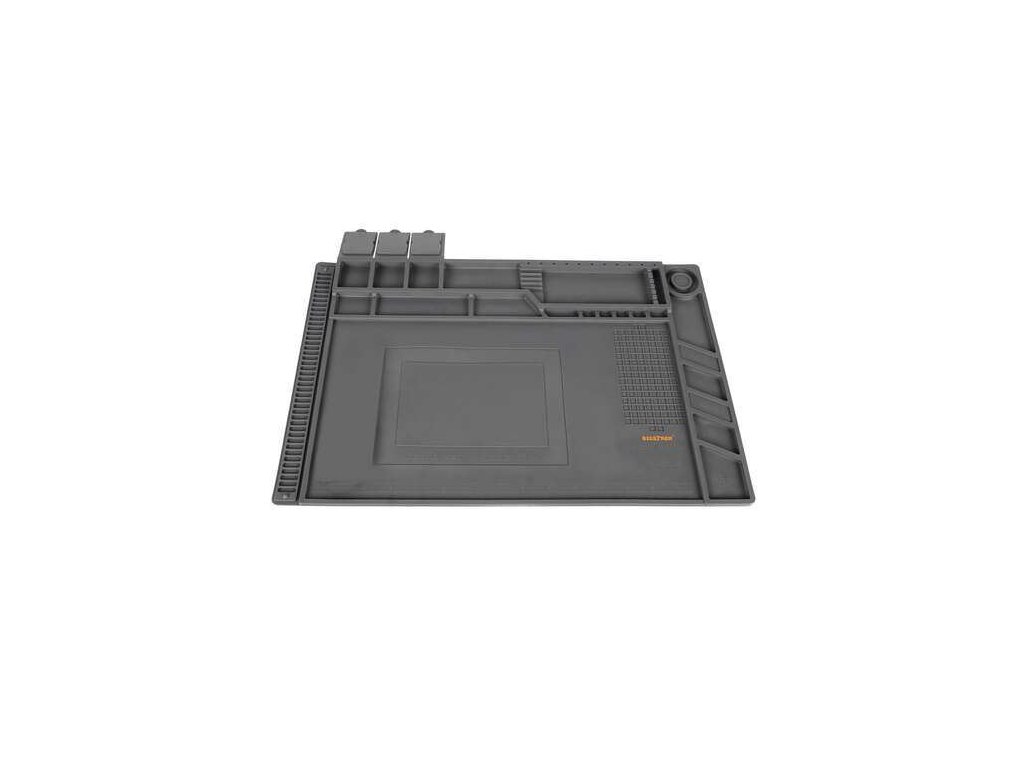 Multifunkční silikonová servisní podložka je nutností pro každého amatérského i profesionálního kutila. Velmi usnadňuje provádění všech elektronických oprav a pájení. Odolné vůči vysokým teplotám (až500 stupňů Celsia) a deformacím. Má 4 magnetické body: pro magnetizační šroubováky, pro díly a šrouby, stejně jako četné přihrádky a lineární stupnici v centimetrech a palcích.SPECIFIKACE: