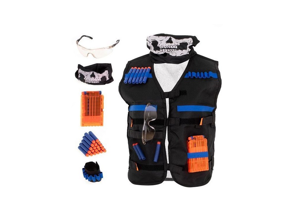 Místo pro vložení šipek<BR/>Pružné pásky pro uložení příslušenství<BR/>Kapsa na šípy<BR/>Držák zásobníku<BR/>Vesta neomezuje pohyb.<BR/>Univerzální velikost padne každému dítěti.<BR/>Ve spodní části vesty je popruh nasuchý zip s možností nastavení<BR/>Zezadu je všitá prodyšná síťovina<BR/>Rozměry vesty (měřeno naplocho):<BR/>Délka: 52cm<BR/>Šířka: 46 cm<BR/>Extra šípy a zásobník<BR/>20 šípů a dva zásobníky (plastové a ve formě řemínku) zpříjemní zábavu a zajistí, že budete mít vždy při sobě zásobu šípů.<BR/>Brýle<BR/>Rozměry : 48 x 9,5 cm<BR/>**Obsah balení:** <BR/>Taktická vesta pro malého válečníka<BR/>20x nerf šipky<BR/>Zásobník na 6 šípů<BR/>Náramek<BR/>Ochranné brýle<BR/>Bandana na obličej s potiskem <BR/>Vhodné pro děti od 3 let.Dodatočné parametre