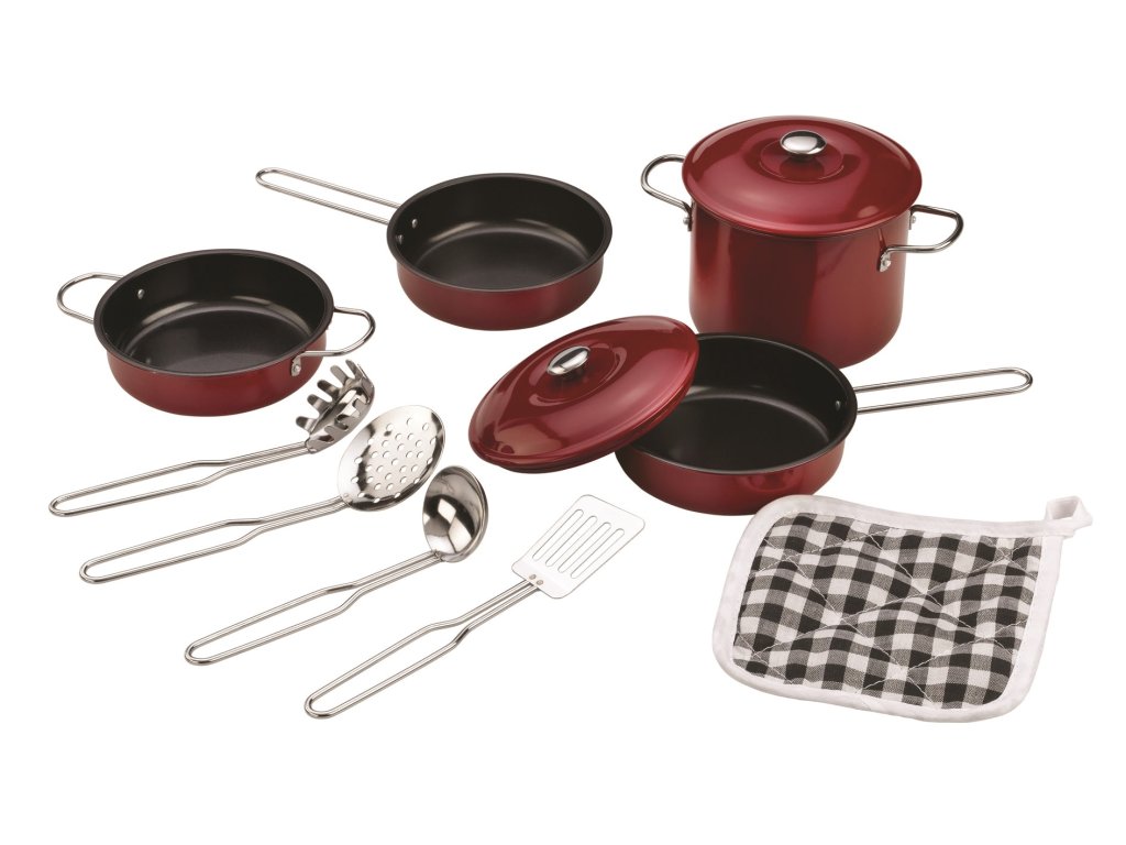 Mladí nastávající kuchaři jistě toto vybavení kuchyně ocení. Set o 11 kusech obsahuje 2 hrnce a 2 pánve, 3 typy naběraček a obracečku a chňapku. Všechno nádobí bylo zmenšeno, aby s ním mohly dobře pracovat i malé dětské ruce. Skvělý způsob jak děti naučit vařit různá jídla a dodržovat bezpečnost v kuchyni. Podporuje kreativní a představivou hru. Rozvíjí koordinaci ruka-oko, jemnou motoriku a zručnost. Odpovídá evropské bezpečnostní normě. Hlavní vlastnosti: set o 11 kusechpodporuje kreativitu a představivostDodatočné parametre