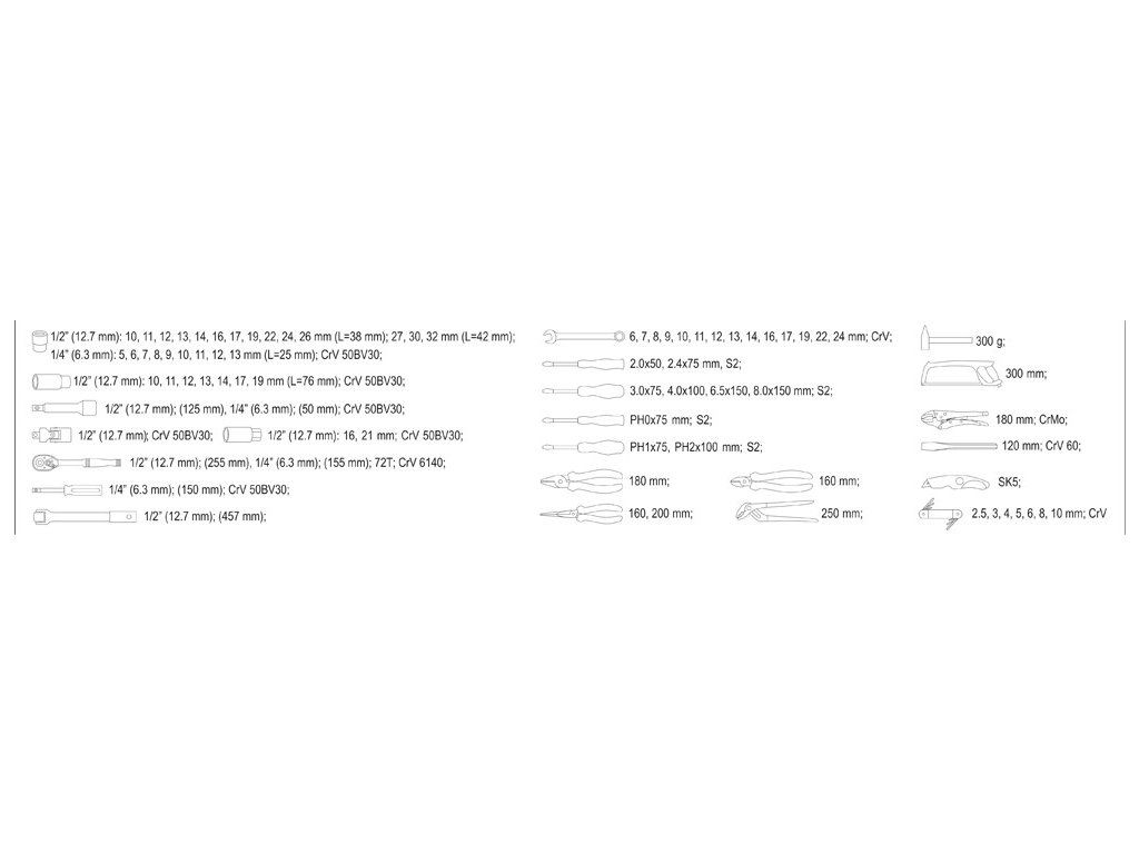 Gola sada 1/2", 1/4" obsahuje 79ks: nástavců, prodlužovacích nástavců, ráčny s plastovou rukojetí, kloubové nástavce očkoploché klíče, kleště, kladivo a další příslušenství. Vyrobené z kvalitní chromvanadiové a chrommolybdenové oceli CrV6140, CrV50BV30, CrV60, CrMo a S2 s funkcí AS-DRIVE.