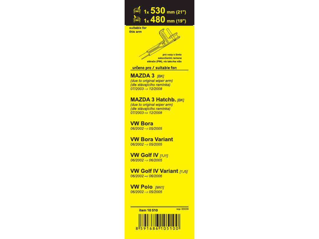 Sada dvou plochých stěračů FLAT (řidič + spolujezdec) se speciálním uchycením. Délky stěračů a systém uchycení na ramínko jsou přizpůsobeny vybraným vozům (viz tabulka použití).