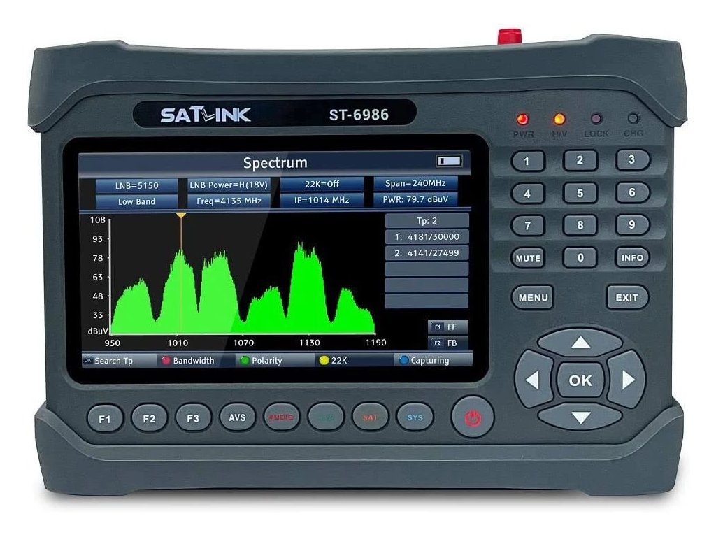 Satlink ST-6986 je kompatibilný s DVB-S/S2/T/T2/C a MPEG-2, H.264/AVC, H.265/HEVC (10 bitov) ručný kombo merací prístroj. Vďaka kompaktnej veľkosti, nízkej hmotnosti, intuitívnemu užívateľskému rozhraniu, dlhou prevádzkovou výdržou batérie a bohatou funkciou, merací prístroj poskytuje všetky potrebné funkcie pre nastavenie Satelitného signálu, DVB-T signálu, DVB-C signálu.