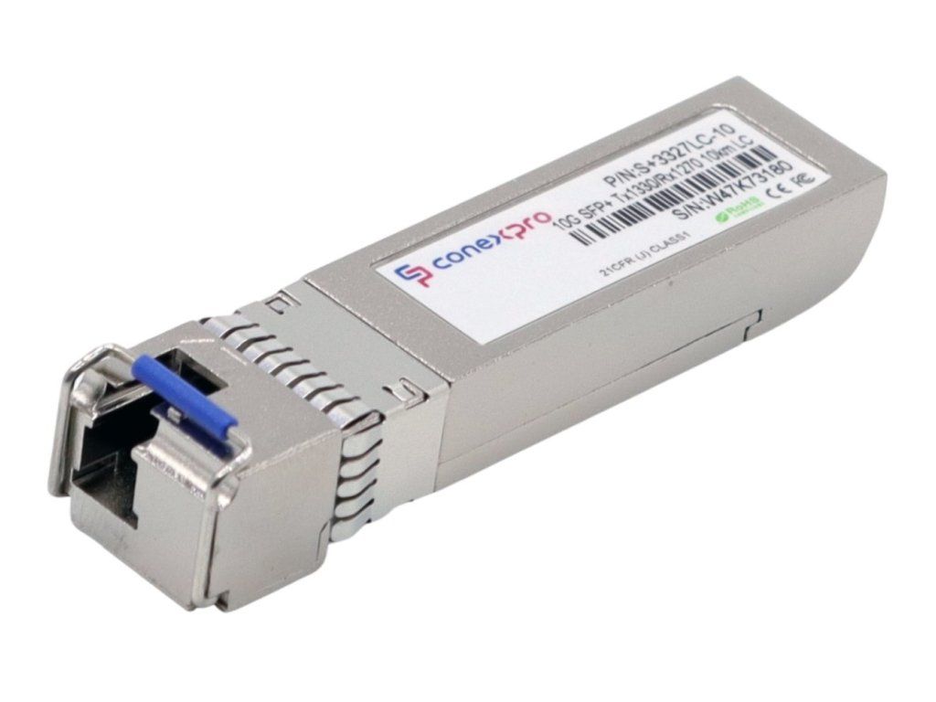 10-Gigabitový WDM/Bidi Singlemode SFP+ modul od výrobce Conexpro s vlnovou délkou (Tx/Rx) 1330/1270nm, rychlostí 10 Gbps, vybavený jedním LC konektorem s UPC broušením a je určený pro spojení na vzdálenost 10 km. Tento modul poskytuje univerzální kompatibilitu, což znamená, že je schopen spolupracovat s téměř všemi dostupnými aktivními prvky. Samozřejmostí je podpora diagnostiky optického spojení pomocí funkce DDM (Digital Diagnostic Monitoring). Pro správnou funkčnost optického spoje je potřeba mít na protější straně optické trasy SFP+ modul s opačnými vlnovými délkami (Tx = 1270nm, Rx = 1330nm).Dodatočné parametre