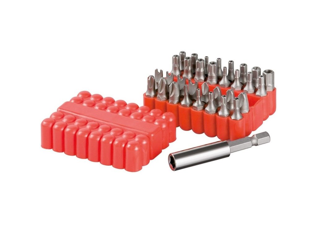 fixPOINT Bit set, 33 ks - vyrobený z CFRV (prémiová nástrojová ocel) - Vyrobené z vysoce kvalitní prémiové nástrojové oceli CFRV pro dlouhou životnost nástroje - Rozšiřující set bitů - Dodává se v pružné měkké gumové krabičce obsah setu: 1 ks. Držák magnetických bitů 6,35 mm 12 ks Hexagonální bity (2; 2,5; 3; 4; 5; 6; 1/8; 3/32; 5/32; 5/64; 7/64; 9/64); 4 ks. Trojkřídlé bity (1-2-3-4); 3 ks. Bity Philips (6-8-10); 4 ks. Speciální bity (4-6-8-10); 9 ks. Torxové bity s otvorem (T8, T10, T15, T20, T25, T27, T30, T35, T40)Dodatočné parametre