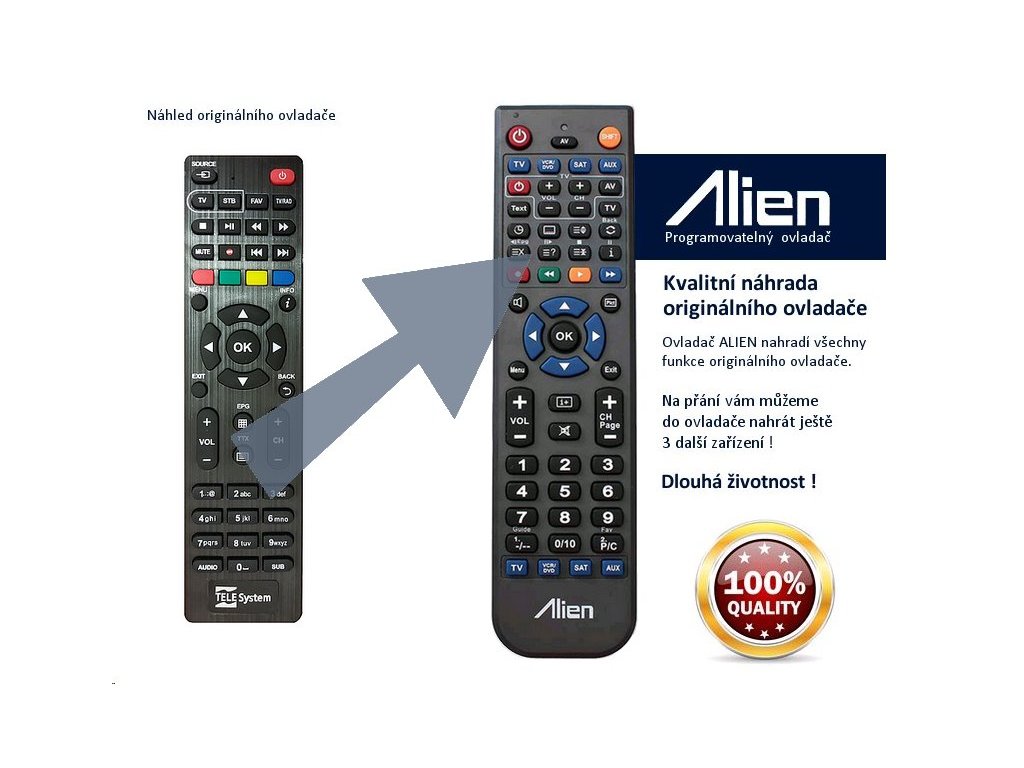Ovladač obdržíte naprogramovaný na vaše zařízení. ALIEN nahrazuje všechny funkce originálního ovladače.