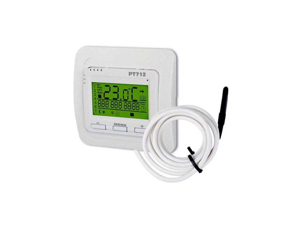 Elegantní řešení termostatu s podsvíceným displejem a externím čidlem v designu spínačů VENUS pro podlahové topení.Vlastnosti podlahového termostatu PT712-EI:PT712-EI je digitální termostat s prostorovým a podlahovým čidlem navržený speciálně pro ovládání elektrického podlahového vytápění. Díky kombinaci vnitřního a vnějšího čidla umožňuje regulovat: