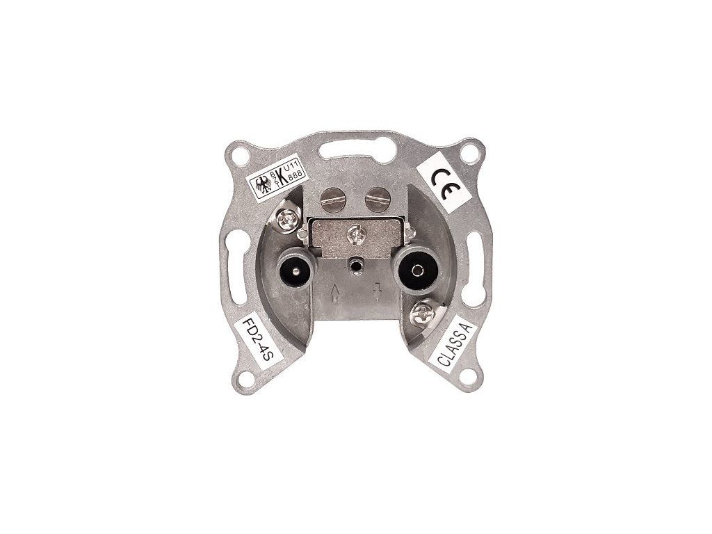 Televizní / Rádio průběžná zásuvka, průchozí útlum 2 dB, odbočovací útlum 4 dB. Útlumy v jednotlivých pásmech: Zpětný kanál 4-30 / AM 0,15-26,1 MHz - průchozí útlum: 2 dB - odbočovací útlum: 4 dB - oddělovací útlum: > 20 dB I pásmo 47-68 MHz - průchozí útlum: 2 dB - odbočovací útlum: 4 dB - oddělovací útlum: > 20 dB FM rádio 87,5-108 MHz - průchozí útlum: 2 dB - odbočovací útlum: 4 dB - oddělovací útlum: > 20 dB Digitální rádio 111- 139 MHz - průchozí útlum: 2 dB - odbočovací útlum: 4 dB - oddělovací útlum: > 20 dB VHF pásmo 120-174 MHz - průchozí útlum: 2 dB - odbočovací útlum: 5 dB - oddělovací útlum: > 20 dB III pásmo 174-230 MHz - průchozí útlum: 2 dB - odbočovací útlum: 4 dB - oddělovací útlum: > 20 dB Superband pásmo 230-300 MHz - průchozí útlum: 2 dB - odbočovací útlum: 4 dB - oddělovací útlum: > 20 dB Hyperband pásmo 300-450 MHz - průchozí útlum: 2 dB - odbočovací útlum: 4 dB - oddělovací útlum: > 20 dB IV a V pásmo UHF 470-862 MHz - průchozí útlum: 2 dB - odbočovací útlum: 4 dB - oddělovací útlum: > 20 dBDodatočné parametre
