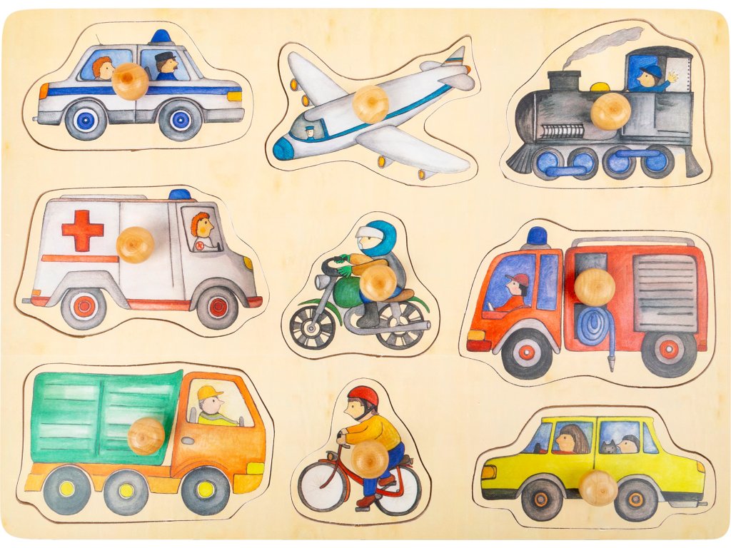 Kdo tady řídí auta, letadla a jiné dopravní prostředky? Robustní puzzle ze dřeva, které má základnu a dále odnímatelné dílky s kuličkou pro jednodušší uchopení. Trénuje jemnou motoriku a trpělivost. Hlavní vlastnosti: obsahuje 9 vkládacích dílůprocvičuje jemnou motoriku a trpělivostDodatočné parametre