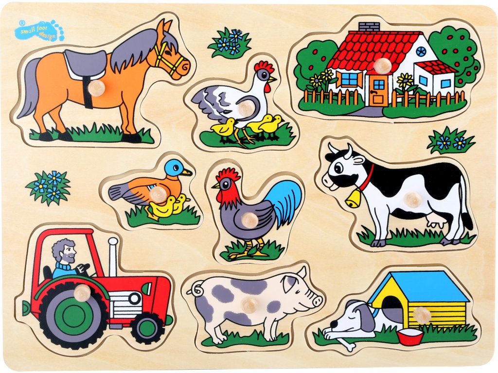 S tímto vkládacím puzzle můžete hravě nahlédnout do života na farmě. Dřevěné puzzle obsahuje celkem devět figurek, které se běžně vyskytují na farmě a se kterými lze snadno manipulovat pomocí dřevěných úchytů. Děti tak trénují jemnou motoriku a koordinaci ruka-oko. Puzzle obsahuje 9 vkládacích dílů - kůň, slepice, statek, kachna, kohout, kráva, traktor, prase a pes v boudě. Hlavní vlastnosti: procvičuje jemnou motoriku trénuje koordinaci ruka-oko9 ks vkládacích dílůDodatočné parametre